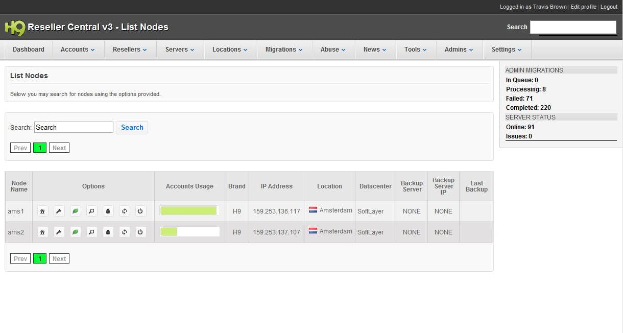 Servers (Nodes) setup within Reseller Central can be fully managed including automatic reboots through the datacenter’s API. Staff can see an overview of all account usage across the Locations available within Reseller Central providing quick access to the Servers that make up that location and options to enable or disable the Location. Some information above has been changed and removed to protect sensitive company secrets.