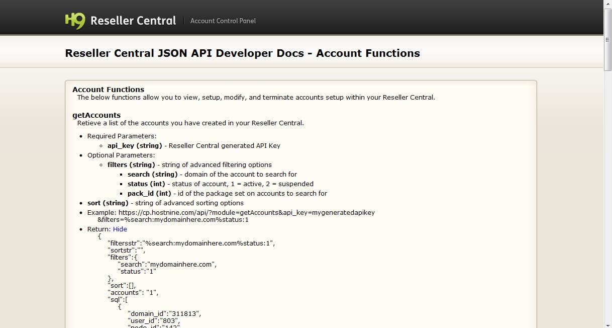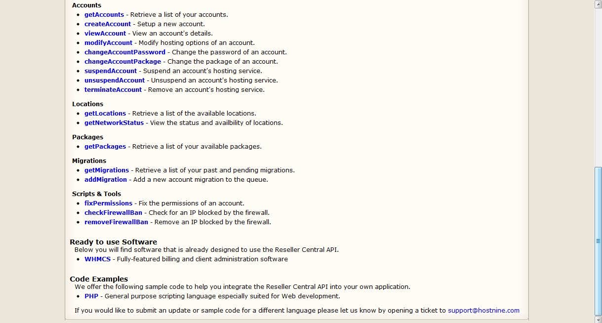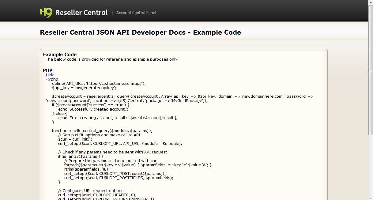 The API is divided into sections and each command has full documentation including prototype calling information and sample return output. Sample code is provided for languages like PHP so that developers can get a head start on integrating the Reseller Central API into their own applications.