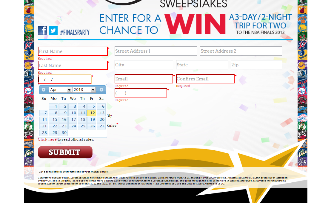 This microsite allows users to enter their contact information for a chance to win the sweepstakes. Users may refer other users with each referred signup gaining them an additional 5 entries into the contest.