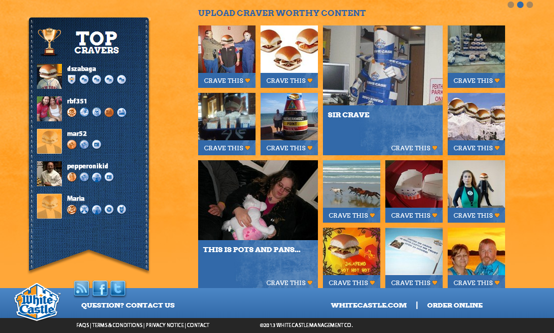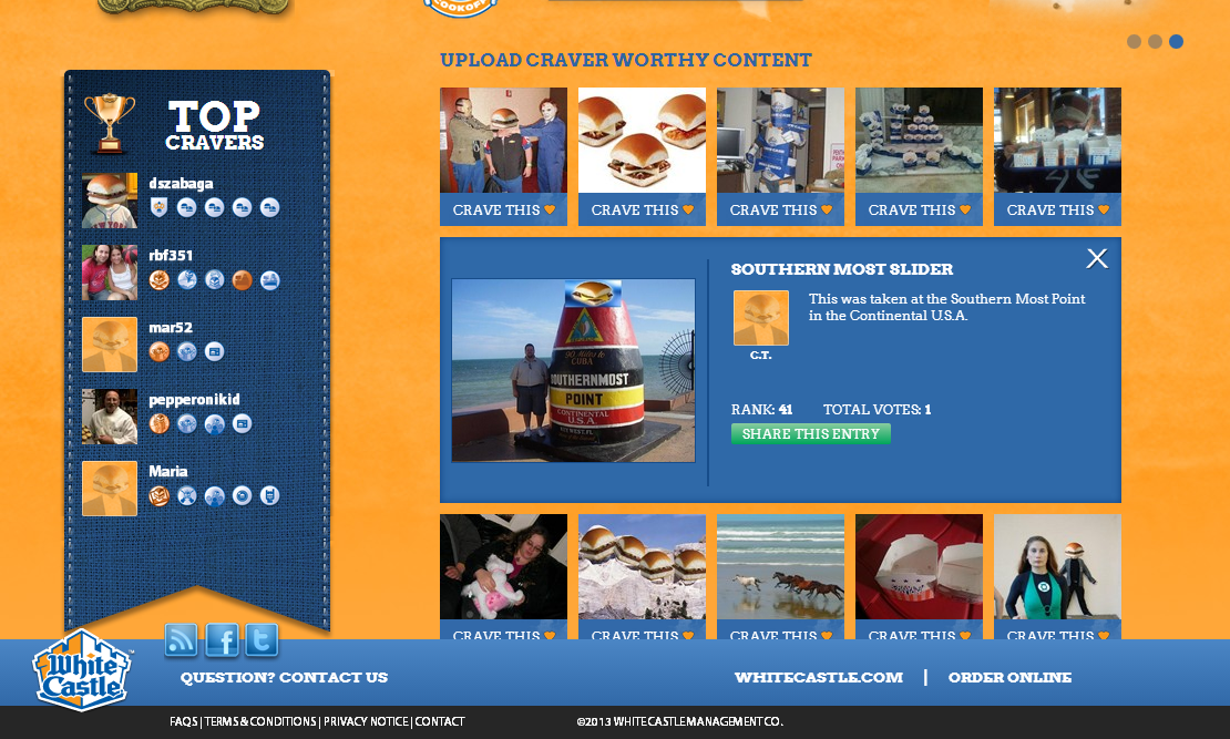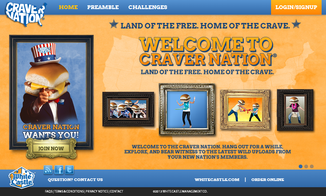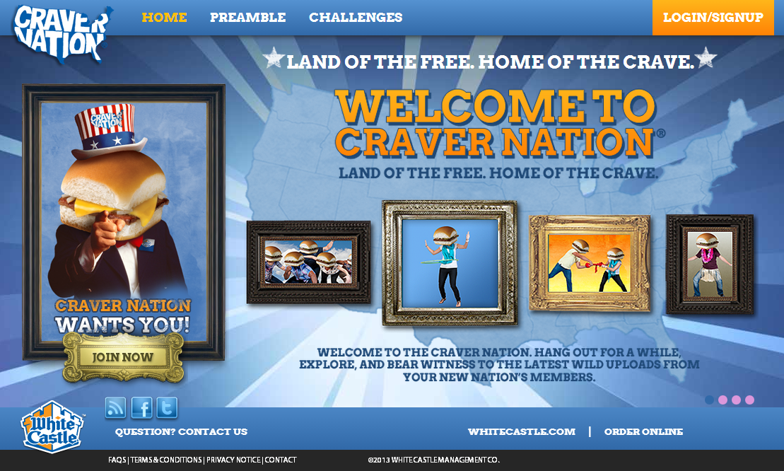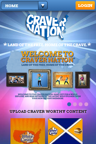 CraverNation is a fan portal sponsored by WhiteCastle and managed by Zimmerman Advertising. Users of the site are awarded points for interacting with site content such as voting on challenge entries, uploading their own content, and even sharing on social networks. These points earn real world things like free meals and merchandise.