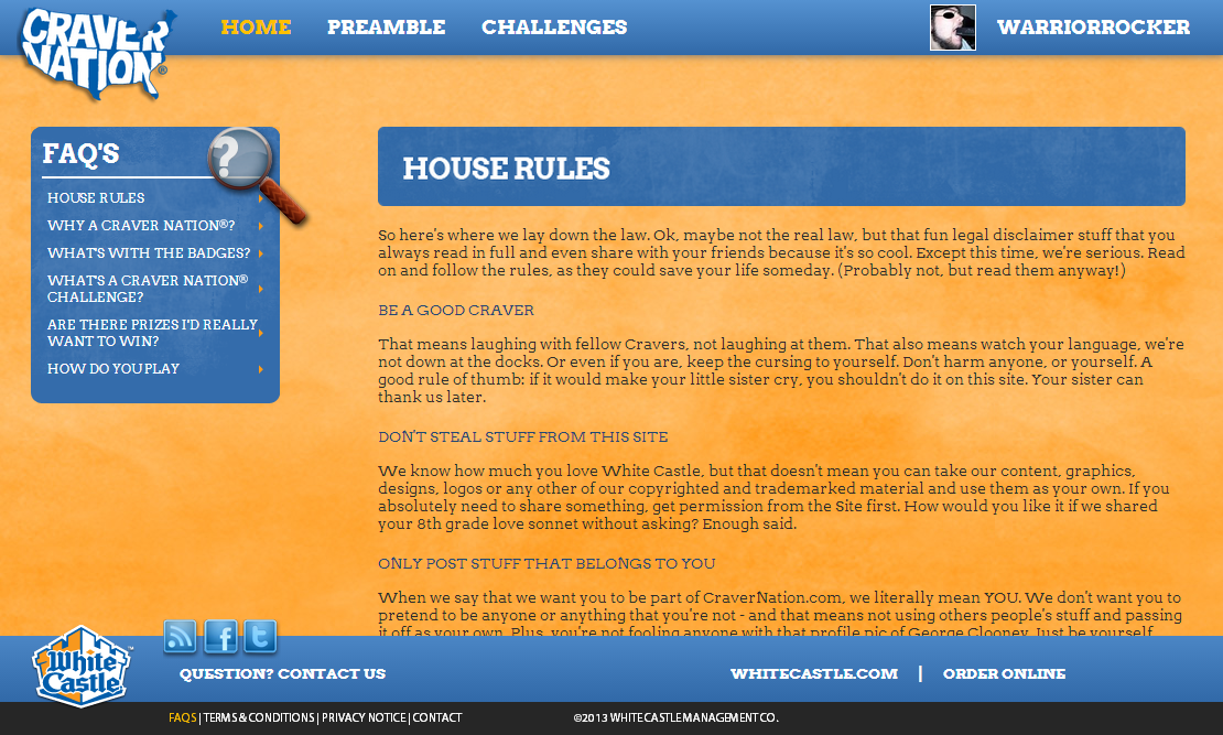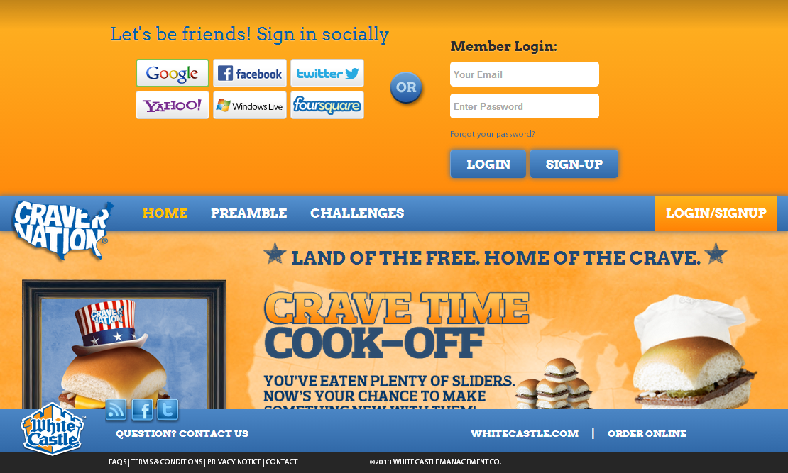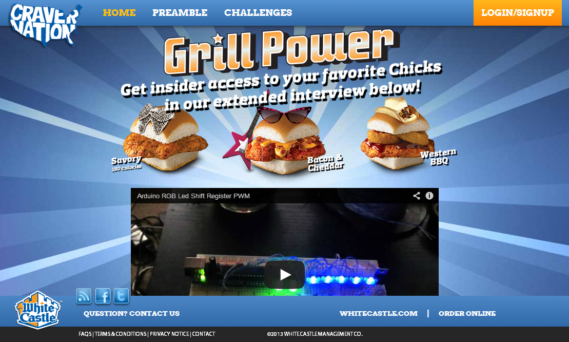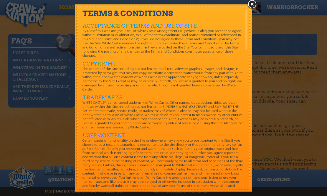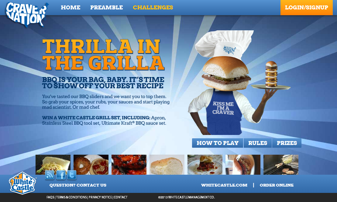 CraverNation is a fan portal sponsored by WhiteCastle and managed by Zimmerman Advertising. Users of the site are awarded points for interacting with site content such as voting on challenge entries, uploading their own content, and even sharing on social networks. These points earn real world things like free meals and merchandise.