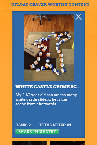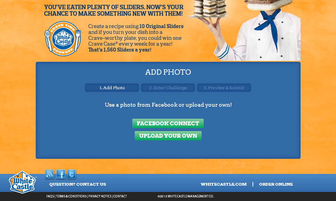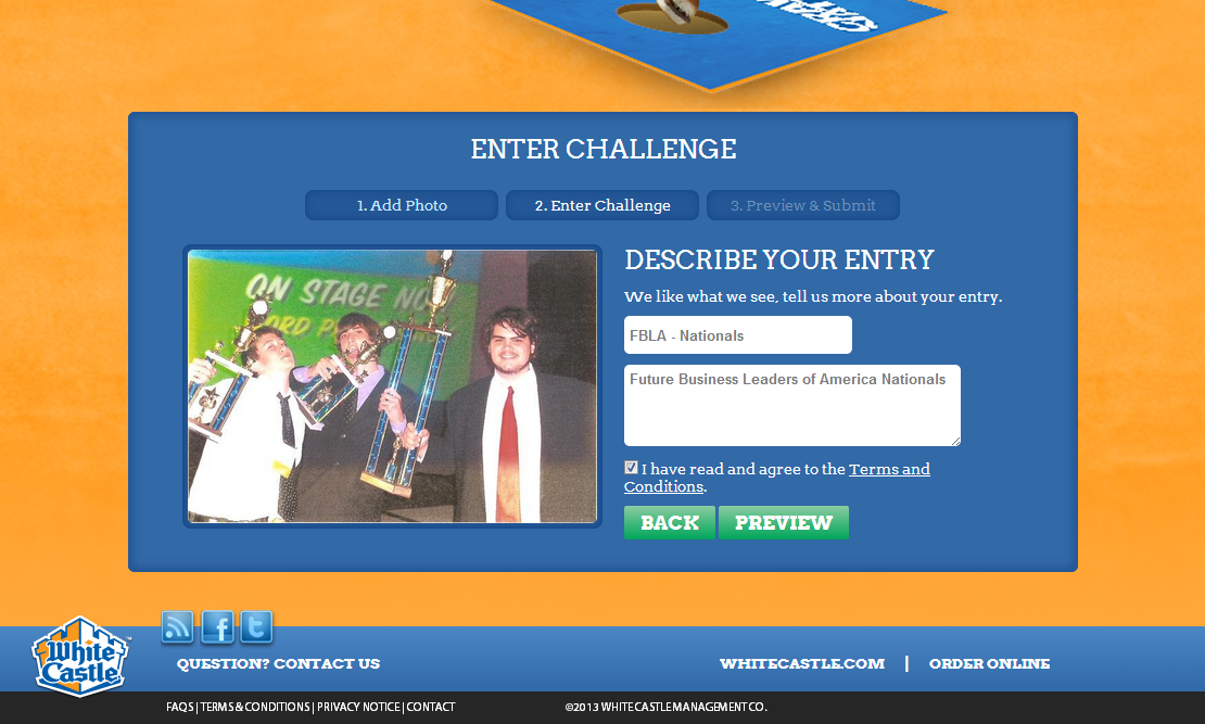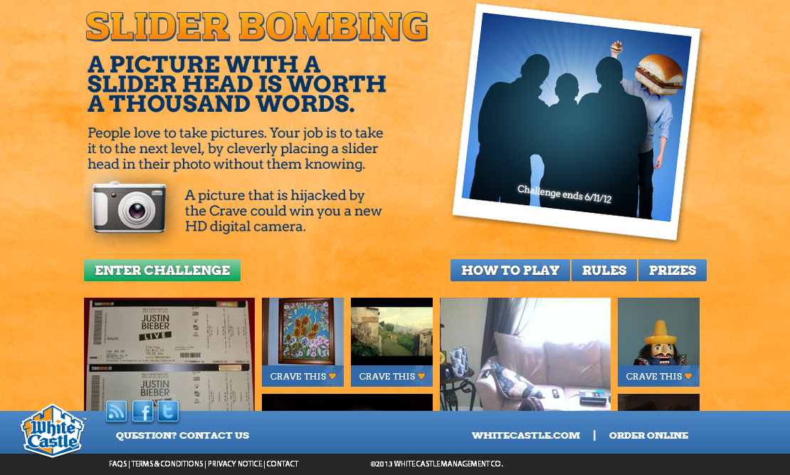 Various challenges are created by the WhiteCastle management and marketing teams and are entered by either uploading a photo or a video. Photos can be selected from Facebook giving mobile platforms a method of uploading content by using Facebook as an intermediary.