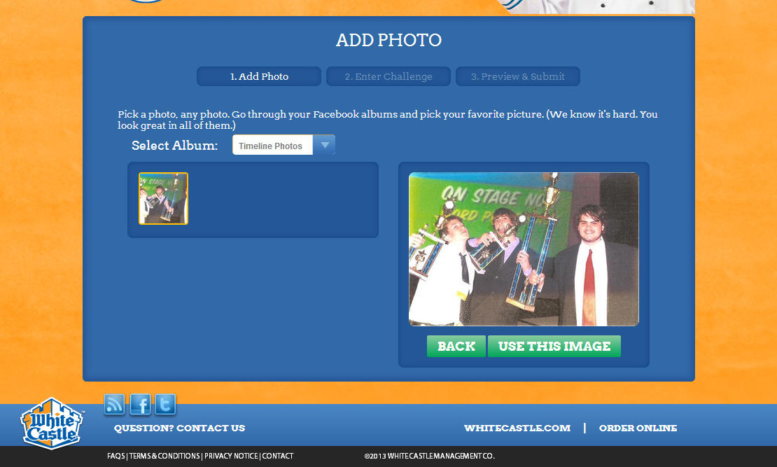 When selecting a facebook image a simple browser appears that allows the user to traverse the various albums that are uploaded and select the right photo. Once selected the entry is then given a title and a description by the user and is then submitted for approval by the WhiteCastle management team.