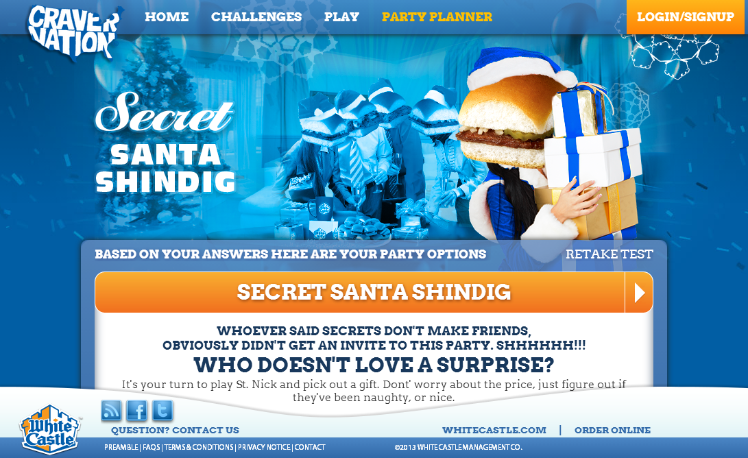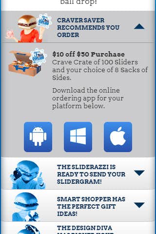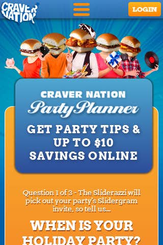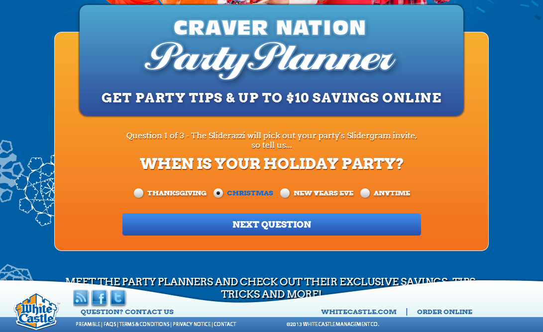 The Party Planner provides a way for WhiteCastle to promote various items in their store and other initiatives by suggesting various party themes to users who answer 3 questions in a quick survey. The Party Planner types each feature their own unique Slidergram card with store items suggested based on the occasion and the amount of people attending.