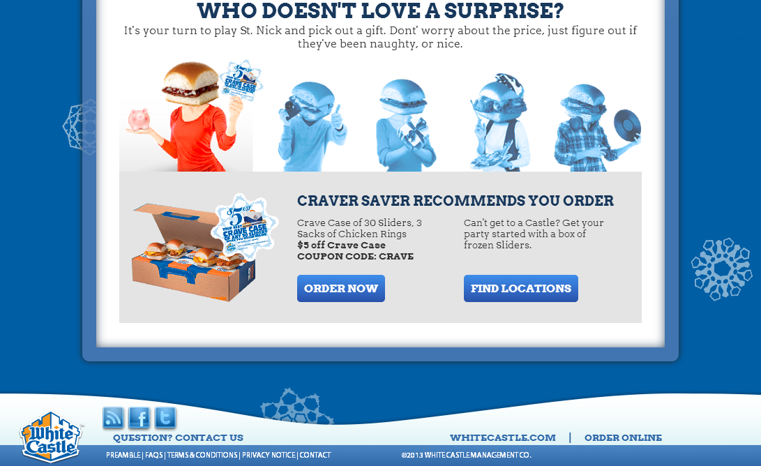 All trademarks and artwork of the White Castle website are property and copyright of White Castle and Zimmerman Advertising and may not be reproduced in any way for any reason with all rights reserved.
