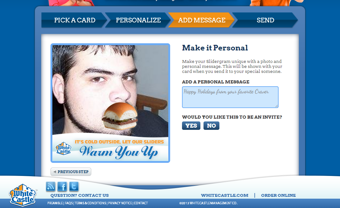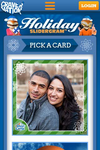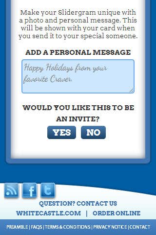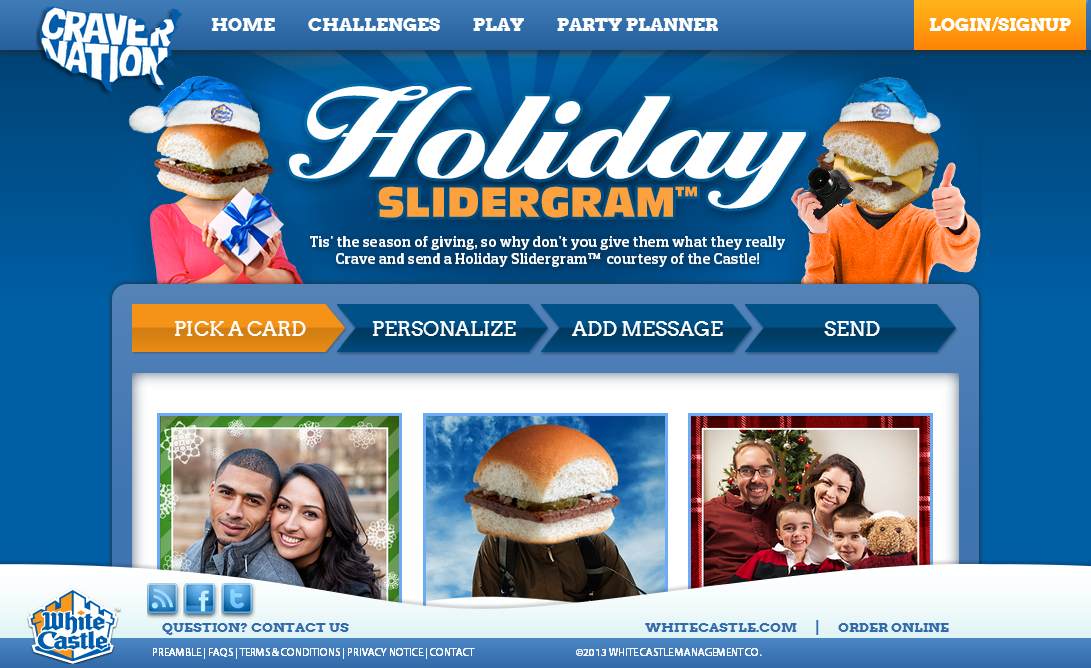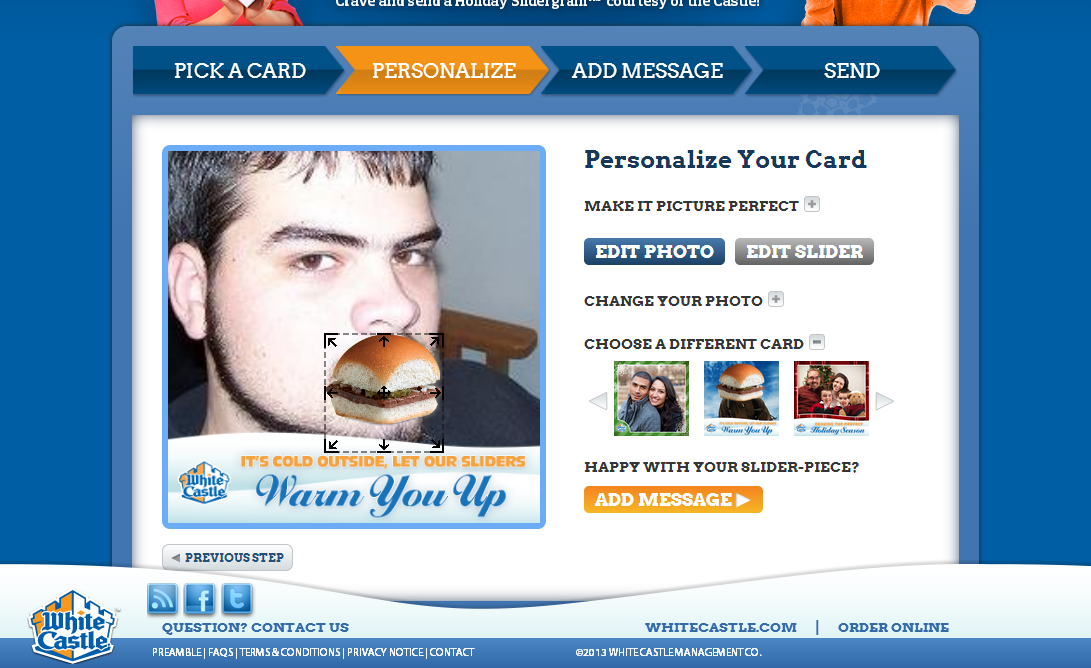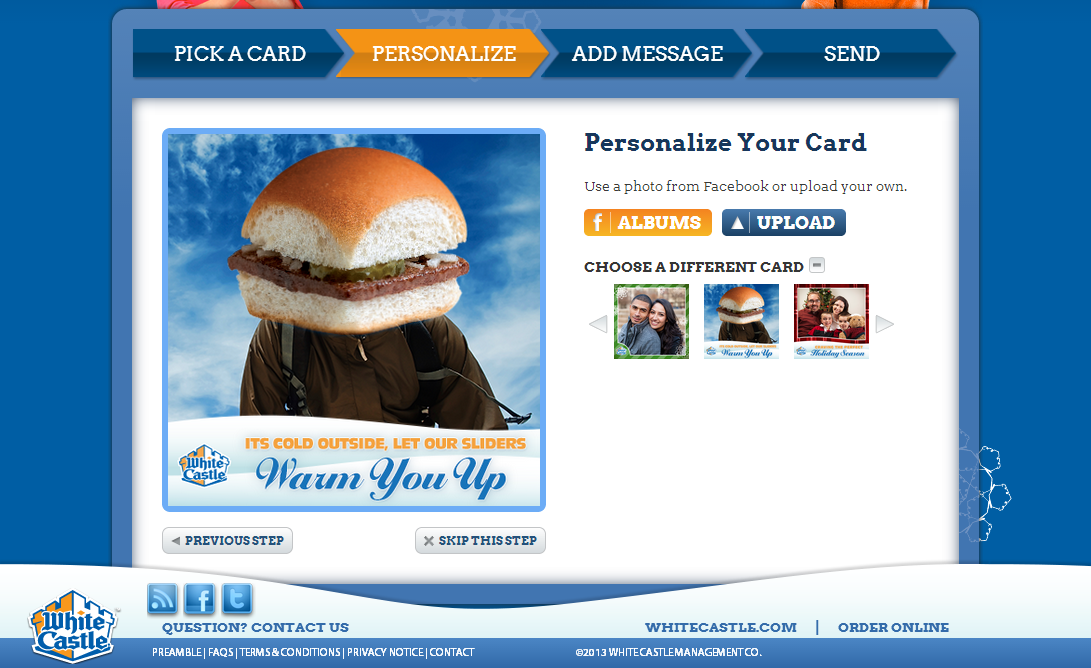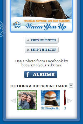 Users can select from any one of several built in card designs that feature WhiteCastle branding and feature items that one can move around and resize to create their own custom card. Personalized pictures can be uploaded either directly from the computer when on desktop or through Facebook Connect which allows the user to browse their albums and select an image to use on their card. This ensures the experience operates on mobile browsers where device image upload is not always possible.