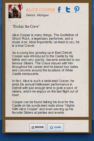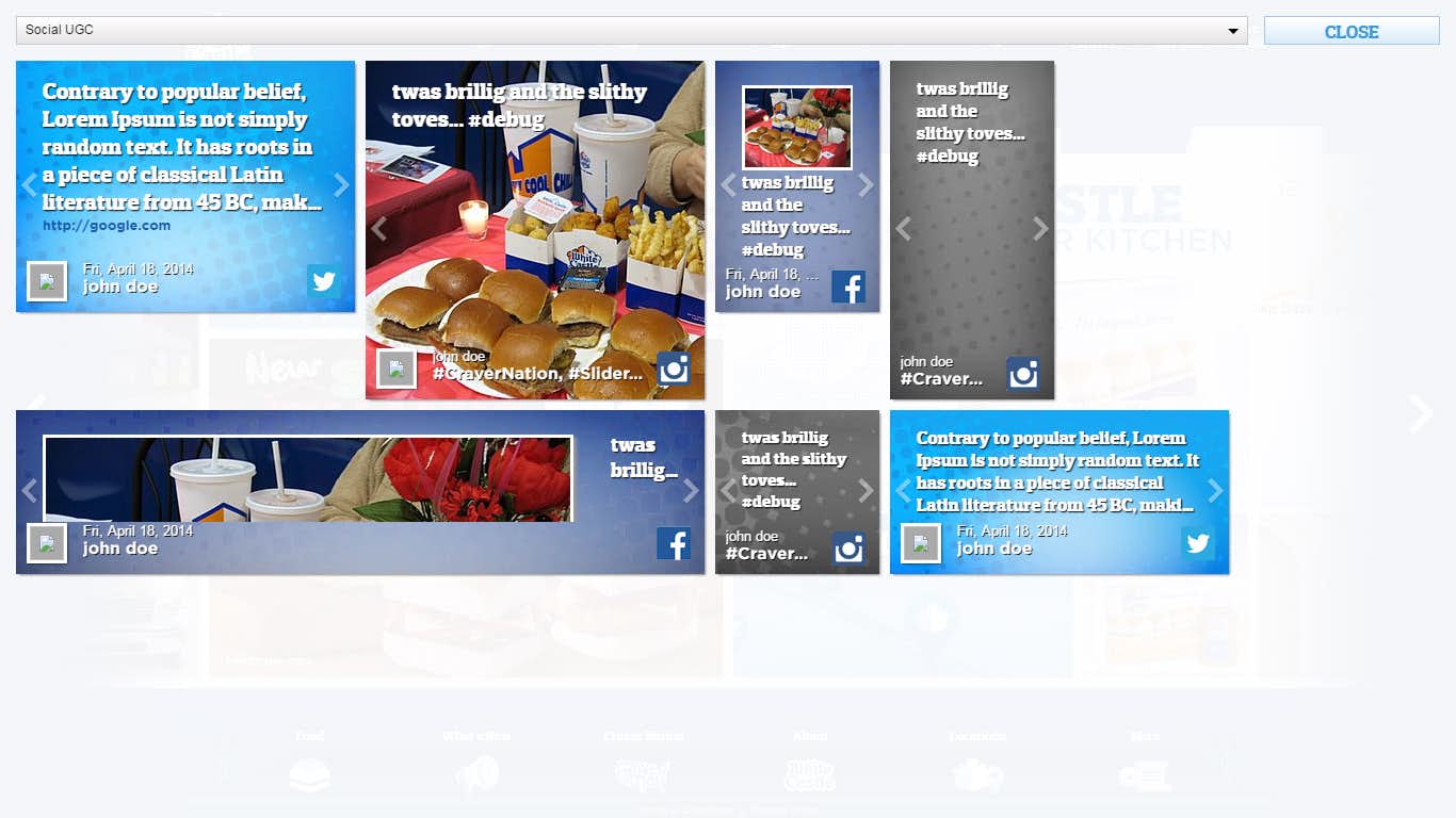 The Tower of Crave is a social UGC based feed that automatically pulls in tweets and Facebook posts for approval in the Admin area. Once approved content will show up on the Tower of Crave ranked by the amount of Craves (likes) by people viewing the feed. Tags can be introduced and filtered allowing WhiteCastle to use the Tower of Crave for varying initiatives and campaigns.