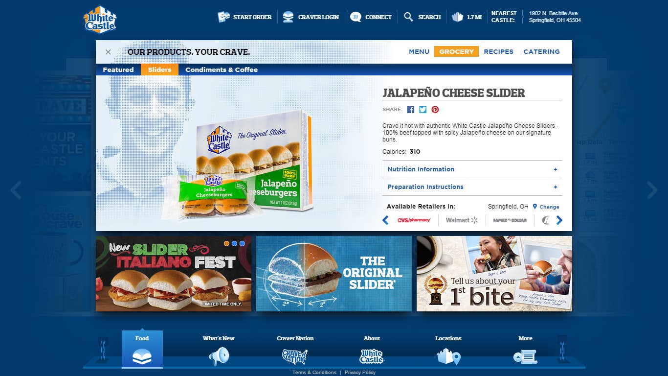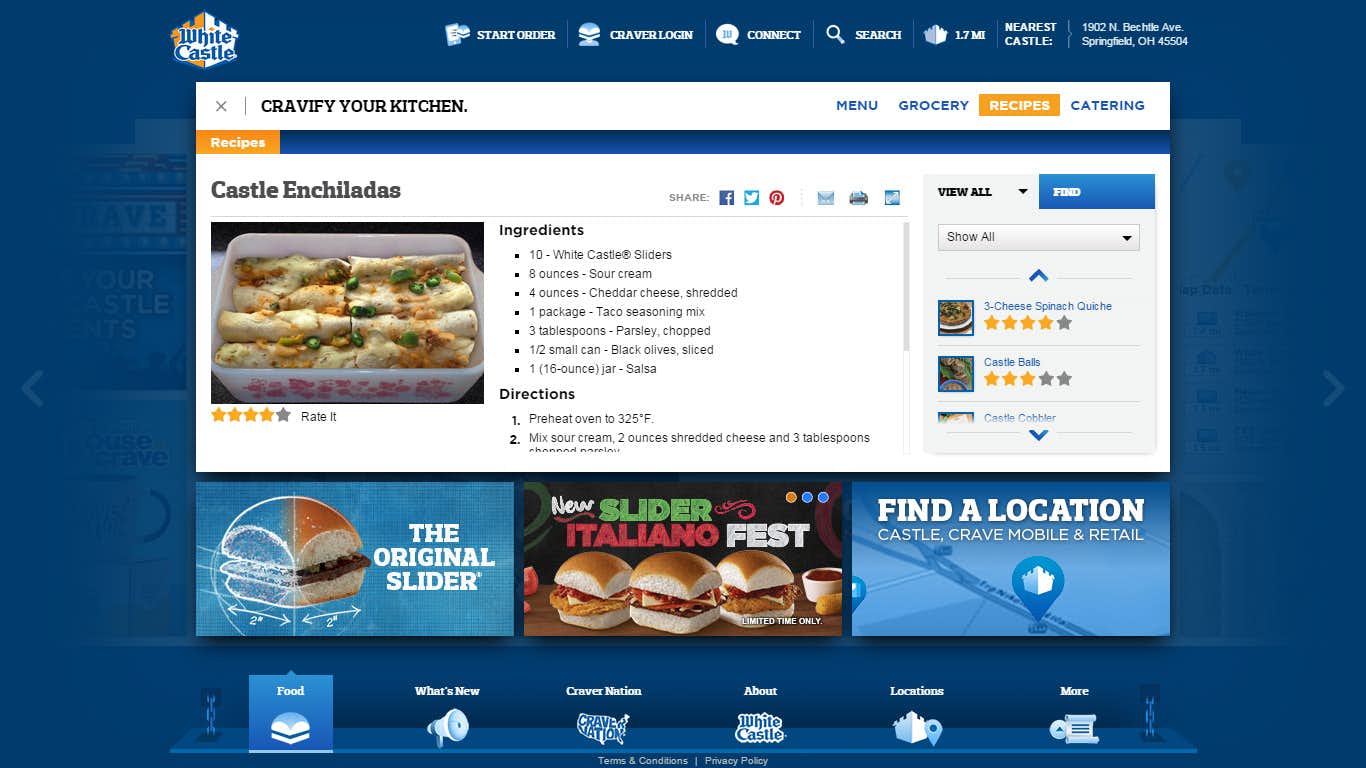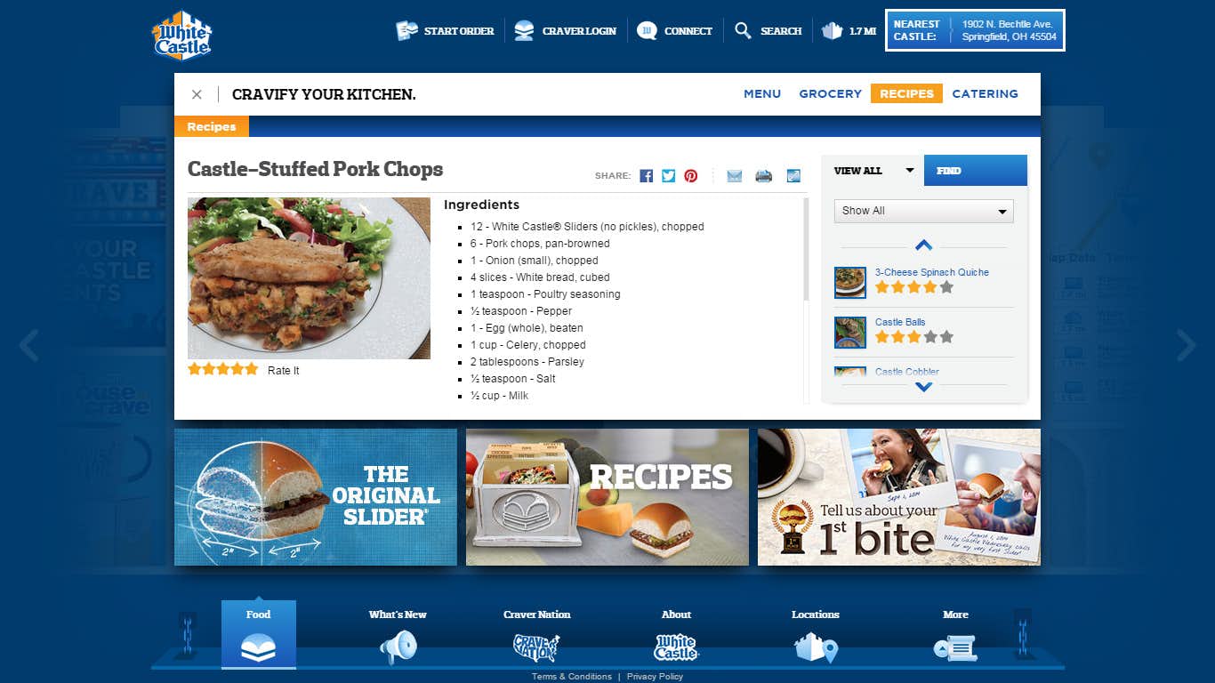 The Food Experience provides the main means by which users can find out more about WhiteCastles core products and menu offerings. An important push was to prominently display products that can be purchased in stores such as frozen Sliders as well as show the numerous Recipes submitted by users over the years that feature WhiteCastle products as ingredients.