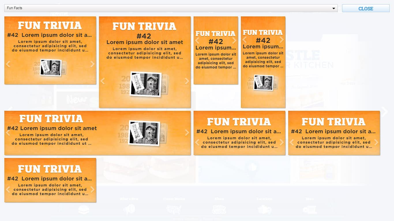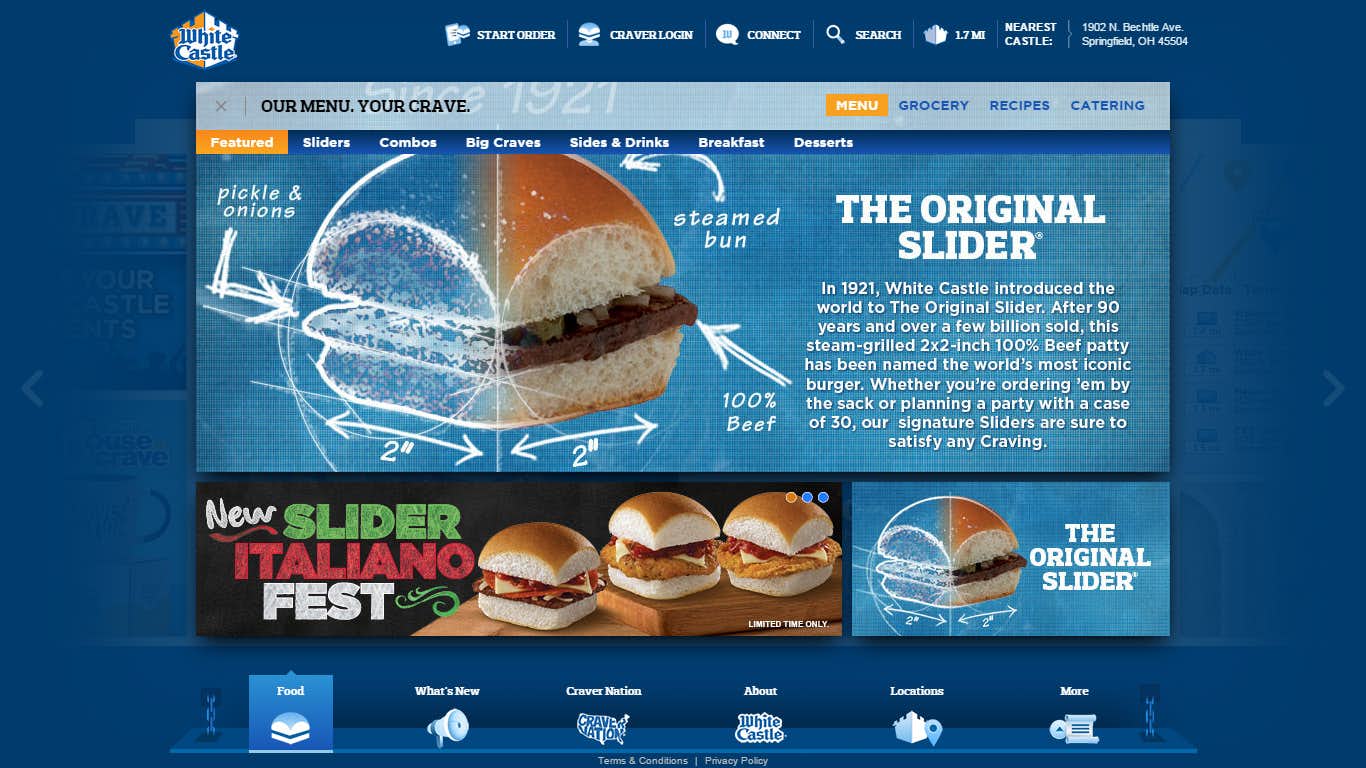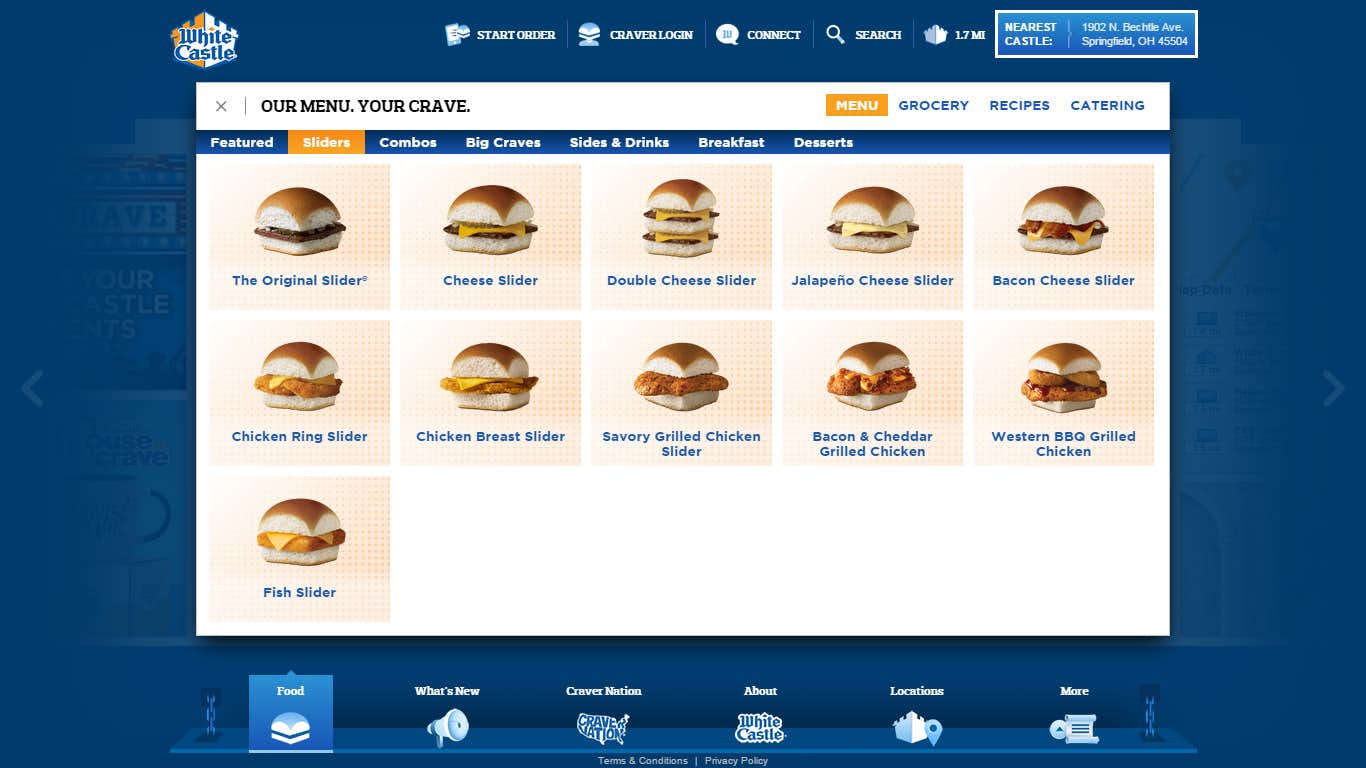The Food Experience provides the main means by which users can find out more about WhiteCastles core products and menu offerings. An important push was to prominently display products that can be purchased in stores such as frozen Sliders as well as show the numerous Recipes submitted by users over the years that feature WhiteCastle products as ingredients.