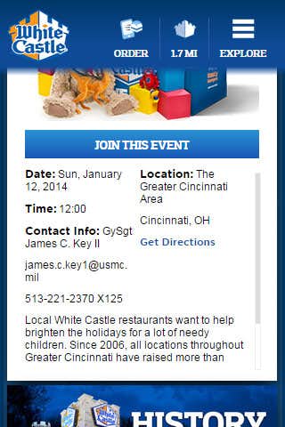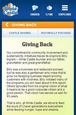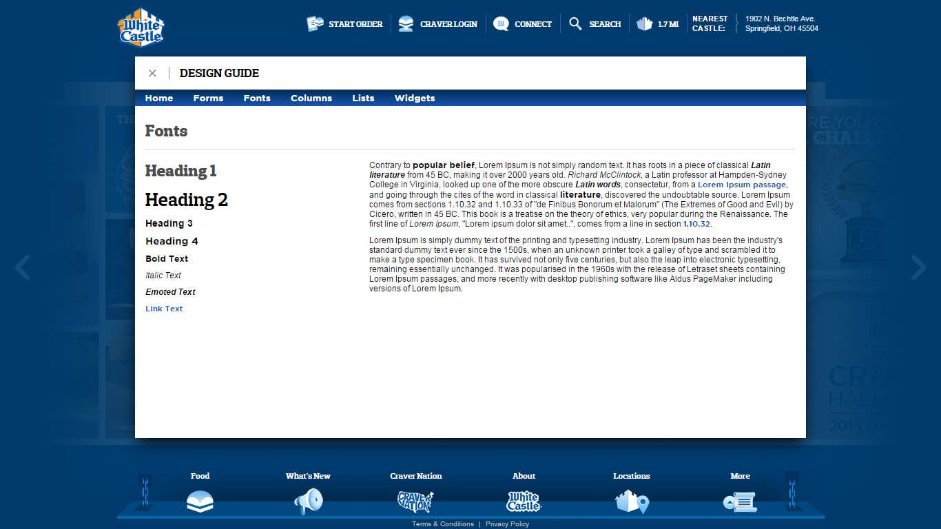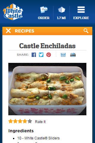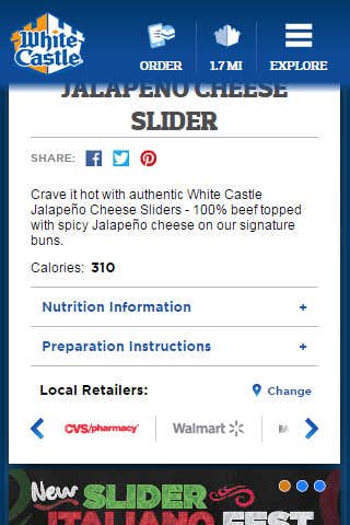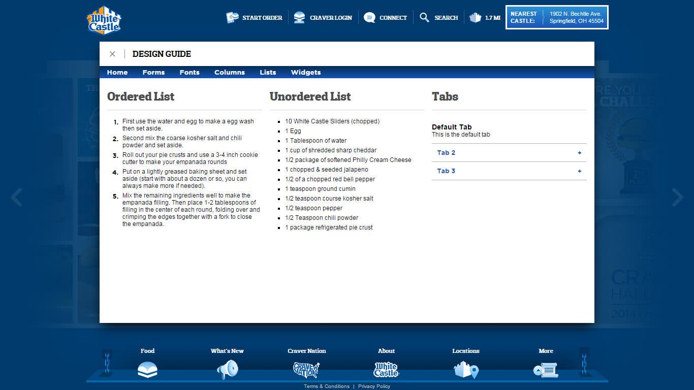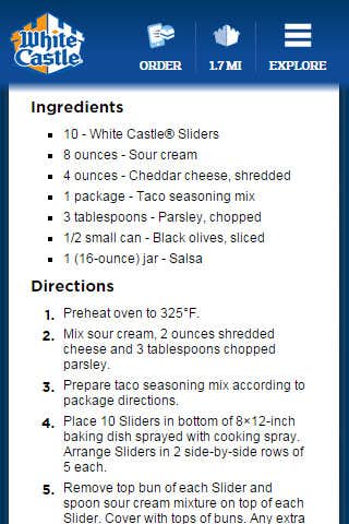 Designing sections such as the informational tabs on the desktop view allows an easy translation to desktop and provides a clean interface to get the most useful information. Recipes show a stacked view of the ingredients and directions which is great when shopping for your next WhiteCastle infused meal.