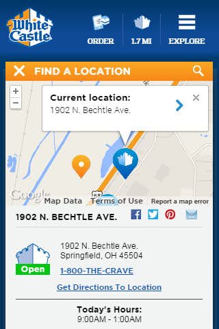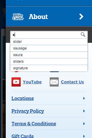 The store locator is important enough to maintain its own icon at all times in the top navigation bar this also means mobile users will have access to the single most used component letting them satisfy that late night Craving. Other items such as the social and search features are streamlined into the overall menu as smaller yet still easy to use sections. Predictive search means less time spent typing and a more enjoyable user experience.