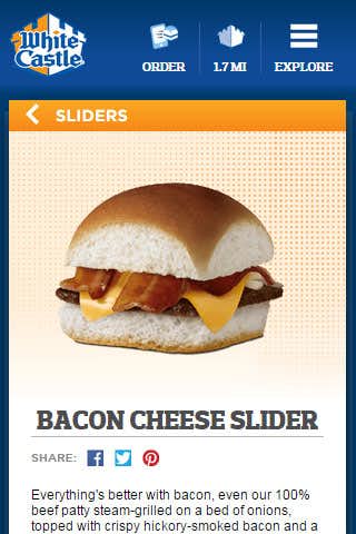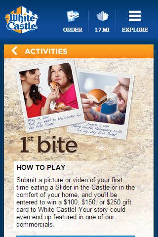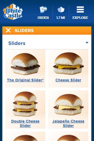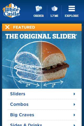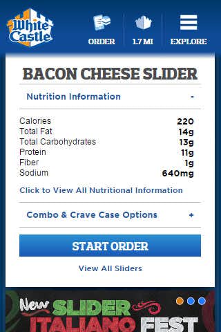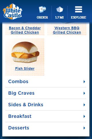 The very first page of the Food Experience is a miniature promotion type page that allows WhiteCastle to feature an item or special that they have going on in stores. Clicking any of the menu items such as Sliders or Desserts brings the user to a grid type page that features a thumbnail view of each item in that section and it’s title.