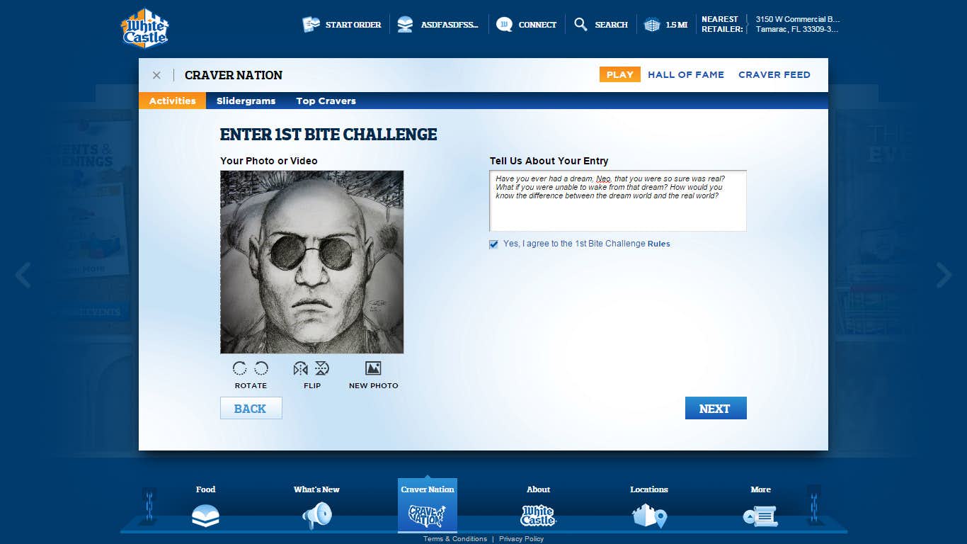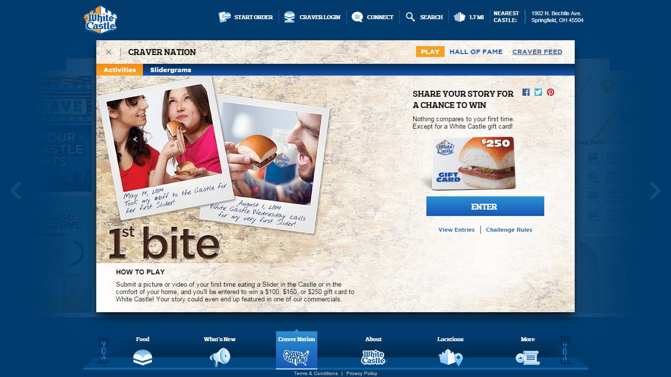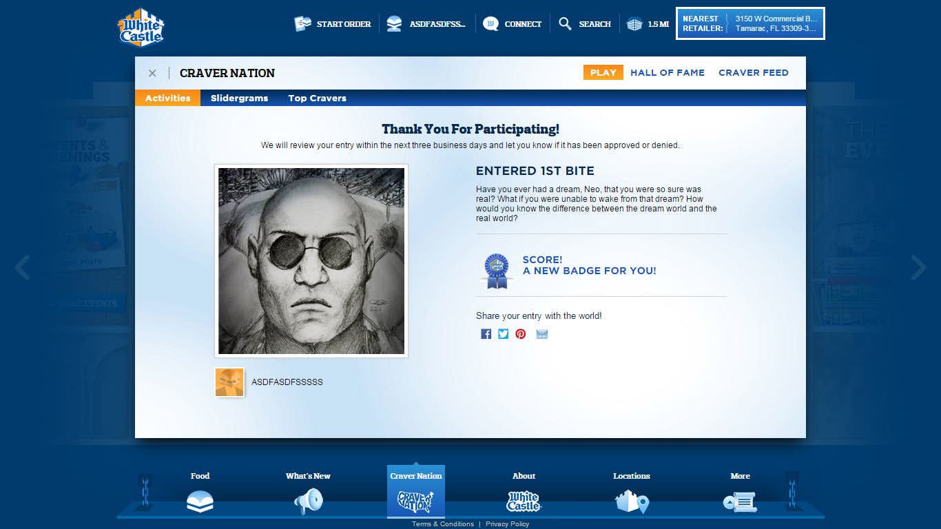 CraverNation has been integrated into the new WhiteCastle site as its own experience and lets users interact with others by competing in various challenges and activities. Challenge entries are placed in the Admin area for approval and can show up as content on various Tiles and other sections of the site as UGC.